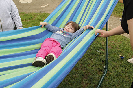 The rhythm that comes with rocking and singing with babies and toddlers outdoors, or sharing rhymes with them as you walk, has the immediate effect of calming them. If you have enough space, sway gently in a hammock with a child, humming, singing together.